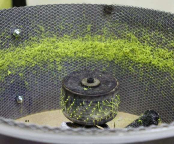 The Polyfloss machine works like a regular candy-floss machine you might find in a fairground. After the waste material is shredded, it is inserted into the rotating oven, where the molten plastic is projected through the small holes onto a drum via centrifugal force. The space between the oven and the drum lining allows the polypropylene to cool down and harden creating fibers. Once cooled, the Polyfloss can be easily remelted to create new objects, ranging from vases to headphones. What's more, any Polyfloss item can be put back into the machine to create new, raw Polyflass, creating a, 'sustainable closed loop system.'