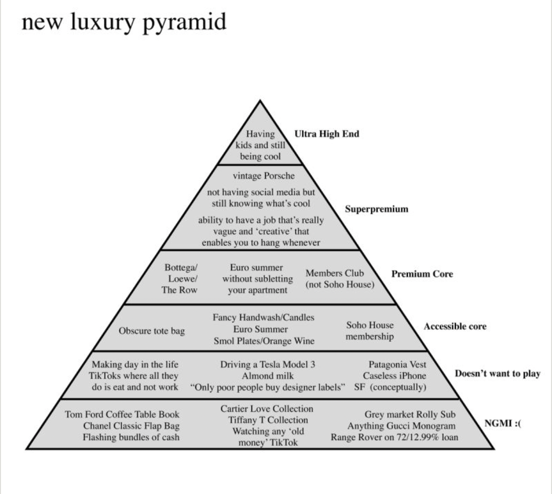 “In the time of the ‘Oat Milk Elite’, status signifiers can be difficult to decode. What once might have been a universal signal of wealth like a Rolex or a Chanel Bag, now can under certain circumstances instead ironically communicate the lack thereof. These days, it seems like we prefer signs that are harder to fake. Taking a photo with a Birkin? Easy. Maintaining your yuppie deluxe lifestyle with two kids and a mortgage? A little harder. Think caseless iPhones, 10.30am fitness classes, not having roommates.”