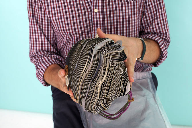 On boarding the flight, each passenger receives a vacuum-packed object which opens to reveal an organic shape, inspired by Icelandic rock, which functions as a book with many layers to explore. When opened, for example, the package releases the scent of vetiver, a traditional Icelandic root, while further within an mp3 device is revealed which transmits tranquil sounds. With a multi-functional design, the book can be used as headphones, or as a soft head rest.