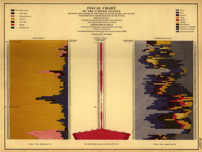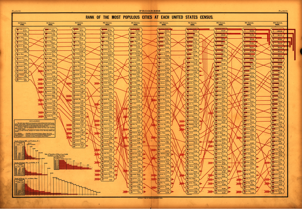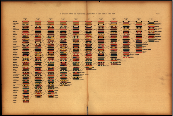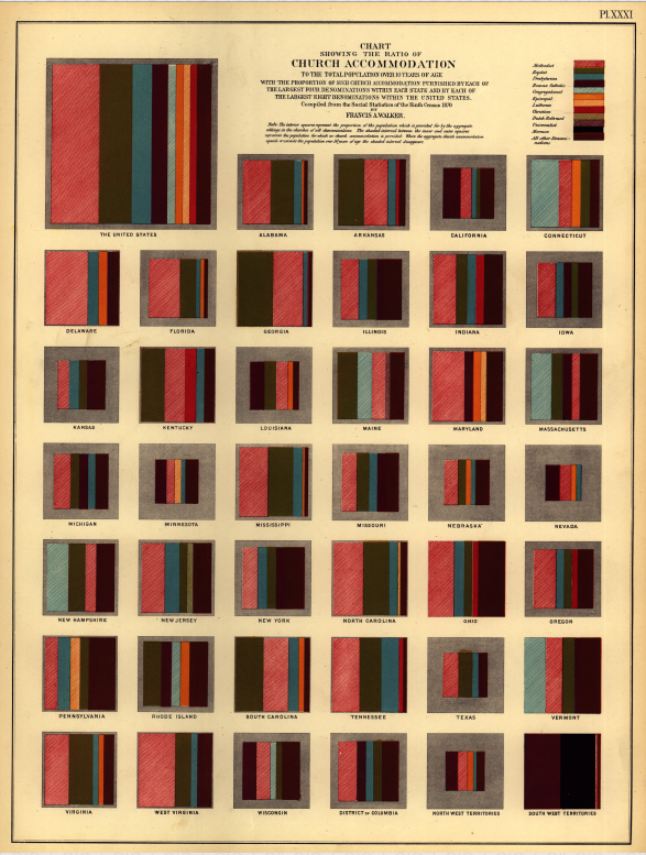After the Civil War the US ramped up their Census and produced some remarkable graphs to display the data. The first Statistical Atlas, published in 1874, was headed up by Francis Walker, with famed topographer Henry Gannett (founding member of the National Geographic Society, and known by many as the 'Father of the quadrangle') taking over the later editions.
