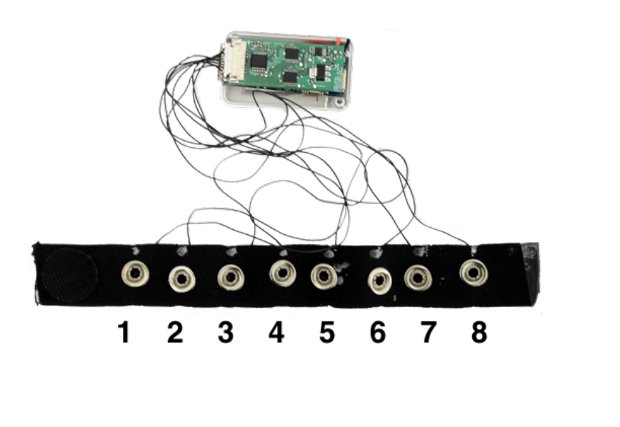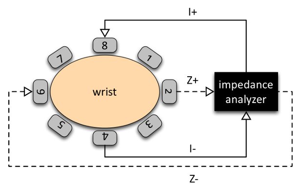 Earlier this year we were inspired by Sensum's innovative use of galvanic skin response to augment videos with biodata-viz. The University of Dartmouth's bioimpedance bracelet uses a similar principle, sensing your bodies resistance to a small electrical current, but in a more sophisticated manner. The prototype sensor aggregates a number of electrical frequencies, effectively what electrical resistance your wristbone, skin and muscle tendons produce together.