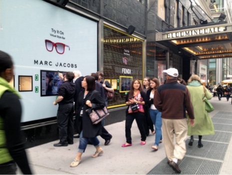 The Lexington Avenue branch has replaced 6 of its windows with interactive sunglasses displays which allows passers by to try on glasses virtually. The displays are LCD screens which identify the location of a viewer's eyes and virtually place a selection of sunglasses onto their face. Each window is dedicated to a different designer (from Marc Jacobs to Gucci) with four sunglasses available to 'try on' per screen. Shoppers can even see what they look like from both a head-on and profile view. If the shopper then decides to buy, they can press a 'print' button which sends a picture of themselves in their desired glasses to the 'Sunglasses Style Bar' where a sales-assistant will help them purchase the real thing.