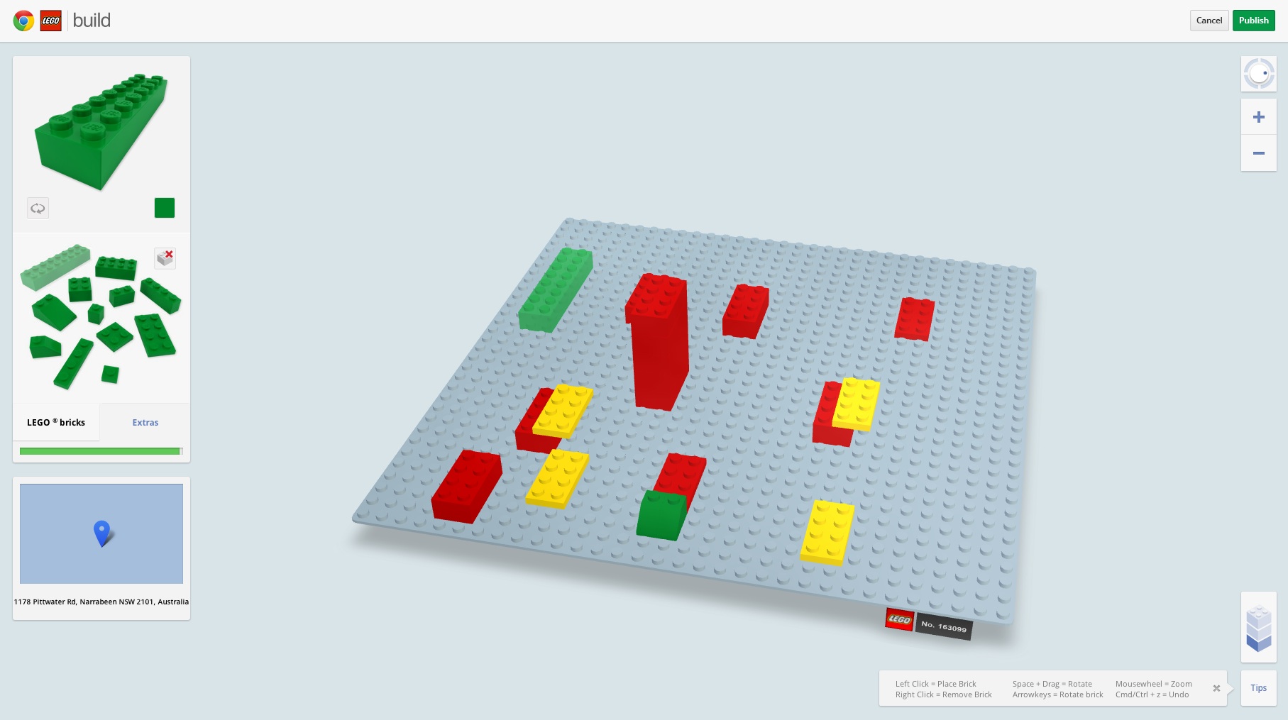 Users are initially presented with a map of Australia and New Zealand, where they can either zoom in to look at previous models or select a plot of their own for their creation. Then it's easy: on a 32 x 32 plot you can choose from the 12 classic brick types (and 10 colours) to play around with at your heart's content. It's simple enough to use, with similar features to Google's 3D modelling tool, Sketch Up.