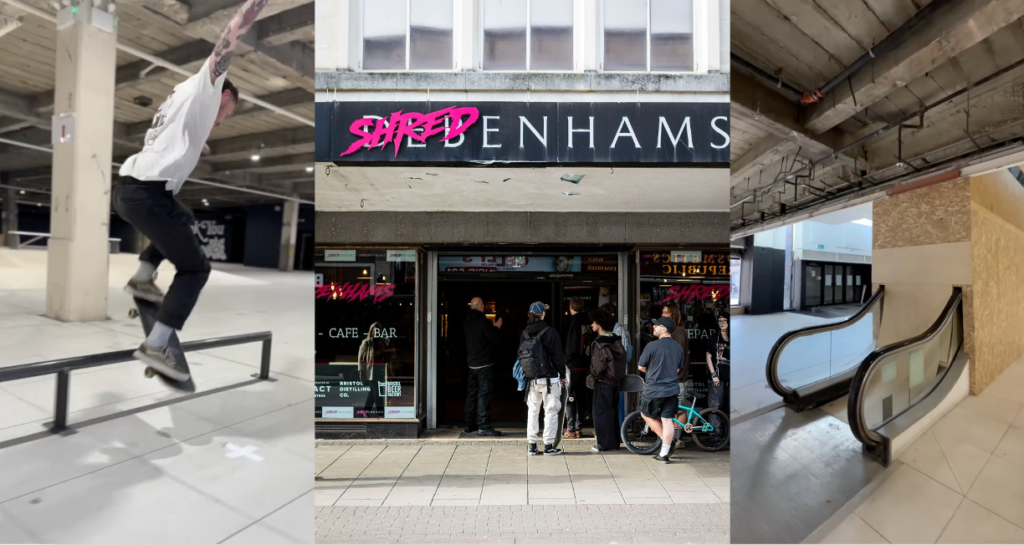 And then there’s Shredenhams in Bristol, which was set-up by the non-profit skater-owned Campus Skateboarding, which transformed a huge, empty Debenhams department store into a massive, temporary indoor skatepark. Under a “meanwhile” planning usage it created a vibrant community hub with skate ramps, games and events before the building’s eventual demolition for a tower block.