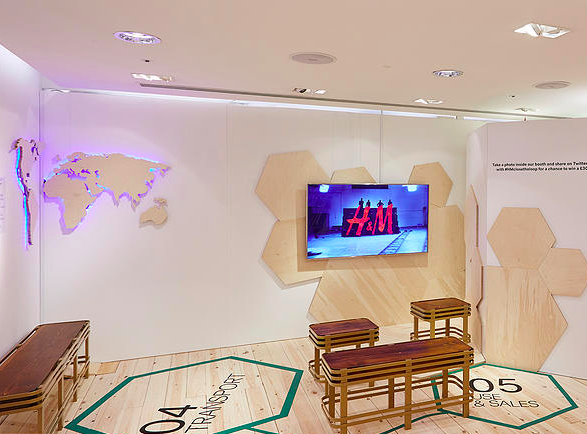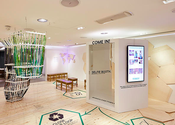 The space highlights how each step of H&M’s supply chain, from design and raw materials to production and end sales, is as eco-conscious as possible. The cleanly designed gallery space was designed to be as minimal as possible, highlighting the values and commitments behind the fashion brand. Interaction was incorporated through a touch screen, a video wall and a live social media feed. Visitors were also encouraged to take a Selfie in the bespoke photo booth and share their photos using the hashtag #Hmclosetheloop.