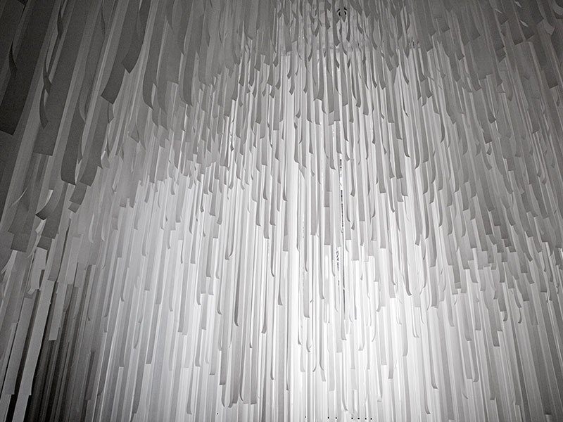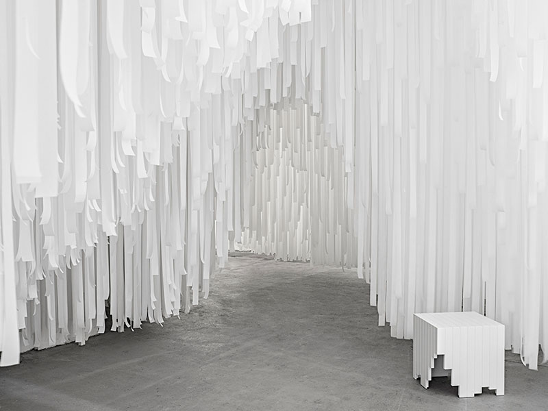 Inspired by COS' spring/summer collection, the installation features technical lightness and luminescence, reflected through an immersive translucent cave. The entire structure is constructed by thousands of strips of layered fabrics hanging from the ceiling to the floor. The duo chose the fabric for its translucent quality and its similarity to a material used in the latest COS collection.