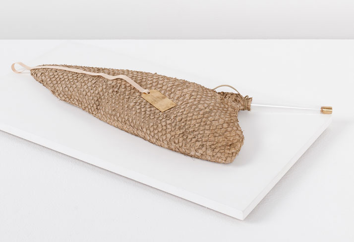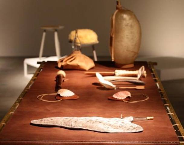 Craftica has been designed by Andrea Trimarchi and Simone Ferrasin and is intended to explore the relationship between leather and other hand-worked and natural materials. By juxtaposing discarded leather from Fendi's cutting room with pig skin, fish skin, cow's bladder, cork and tree bark, not only is leather is presented in a different aesthetic light supposed to evoke its ancestral context, but it helps open a conversation about production, resources and the connection between humans and nature.
