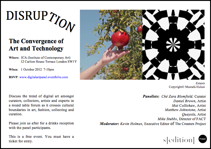 Protein, in alliance with the ICA and s[edition], are proud to announce 'Disruption: The Convergence of Art and Technology", a one off talk on Digital Art and its ubiquity in all areas of creative culture on 1st October, 2012.