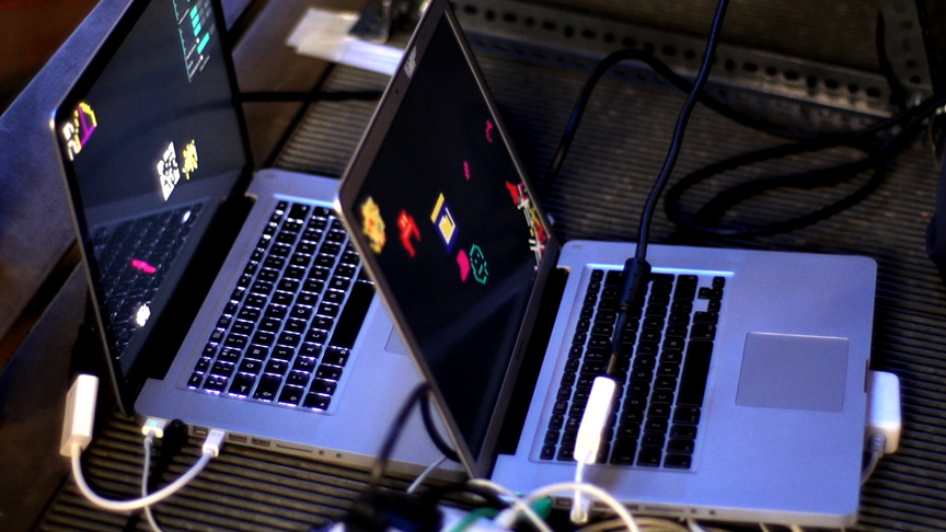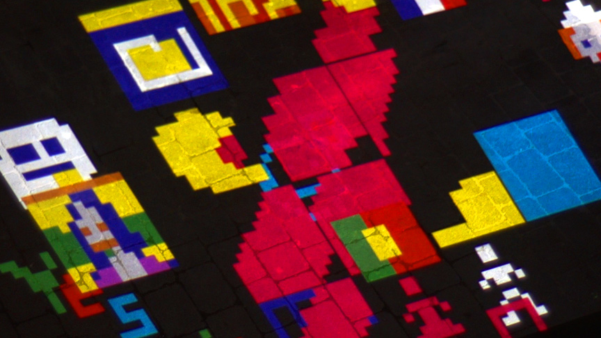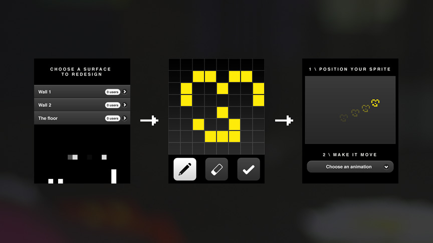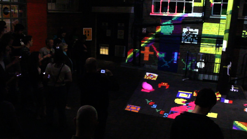 The project's website continues: "At our disposal were two developers, one UX'er, one concepter, three projectors, five laptops, one big idea, ten working days and one all-important screwdriver. And of course a free rein when it came to technology options. Bliss. What we made was essentially a mobile interface that allowed people to create sprites that were projected onto the walls of our courtyard space here at Specialmoves HQ. People could not only design but manipulate their own creations."