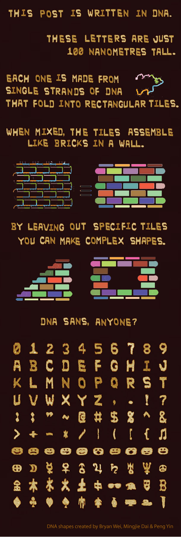 Future typographers take note – if you're not into DNA origami now then you're behind the curve. It turns out DNA isn't limited to being the mere building blocks of life. The proteins which comprise DNA can also be used as component materials within nanotechnology. Which is exactly what the Wyss Institute have demonstrated, by creating an entire font from DNA particles, each character 100 nanometers (billionths of a meter) in size...