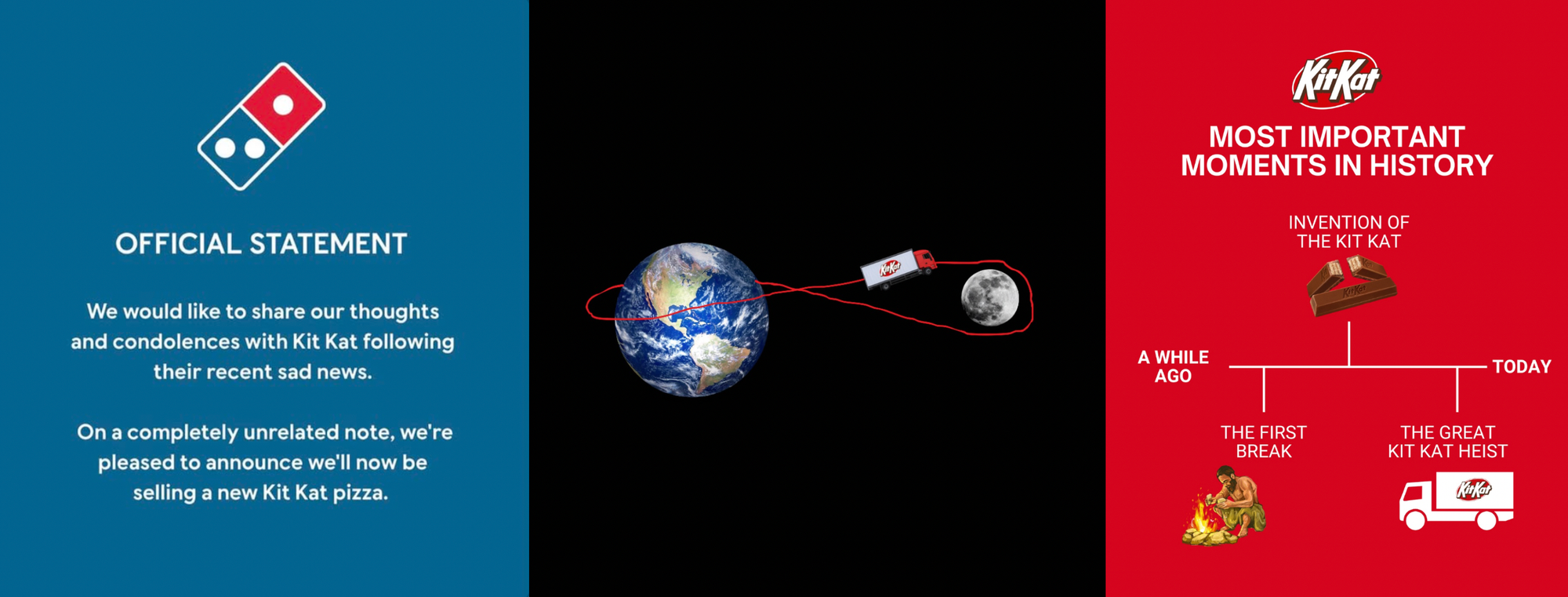 Recently, when 12 tonnes of chocolate were stolen mid-transit, KitKat didn’t panic. It leaned in. Other brands such as British Airways, KFC and (naturally) Ryanair added fuel to the fire. Dominos issued a mock “official statement”, offering condolences and launching a KitKat pizza “on a completely unrelated note”. KitKat followed with heist-movie parodies and a rewritten timeline of history featuring “The Great KitKat Heist”. A crisis reframed as content, then as culture.