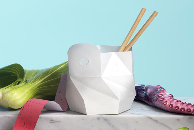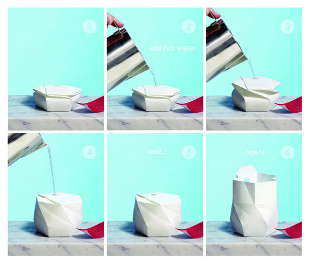 Hot water transforms biodegradable food packaging into a bowl, ready to be eaten from.