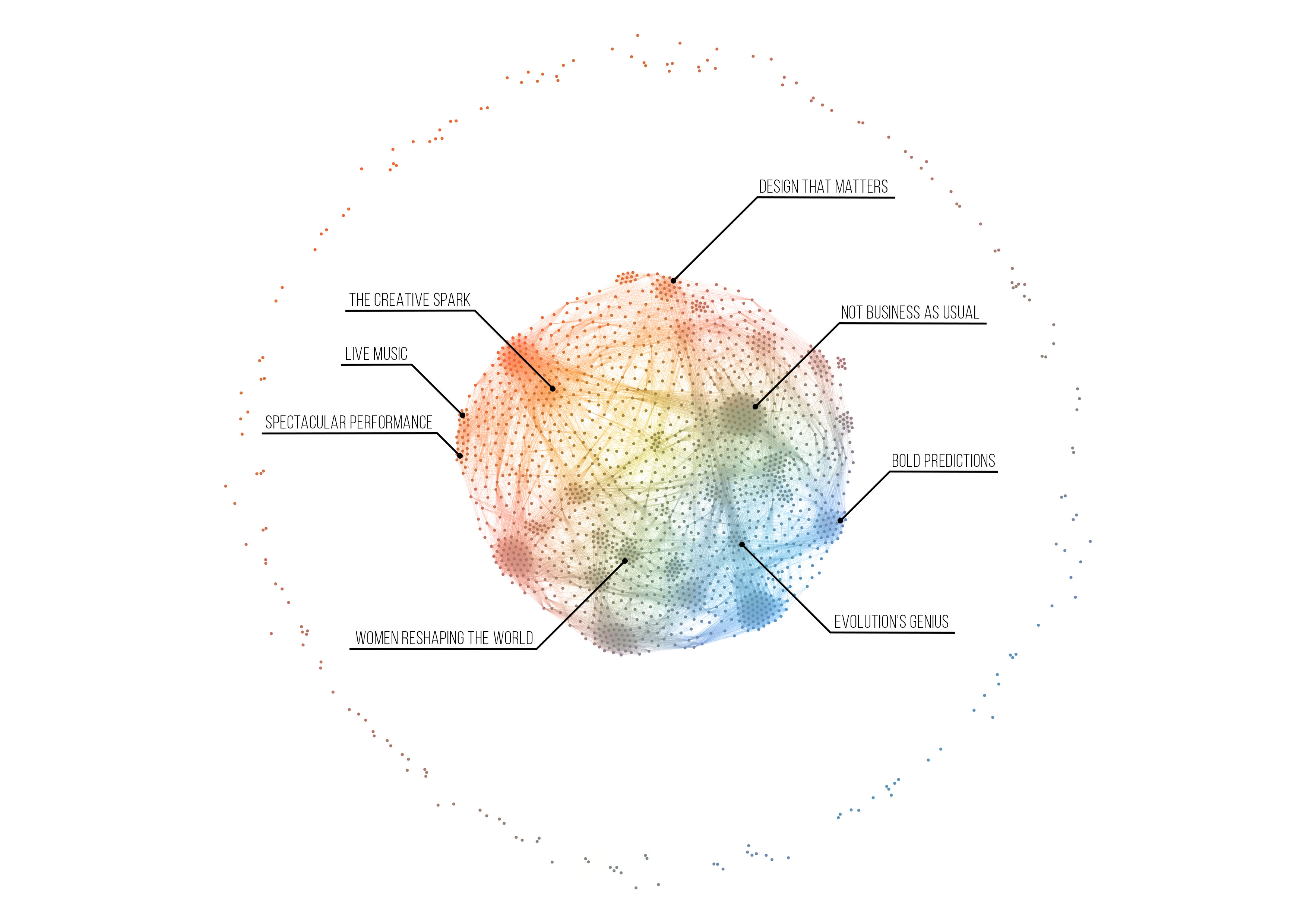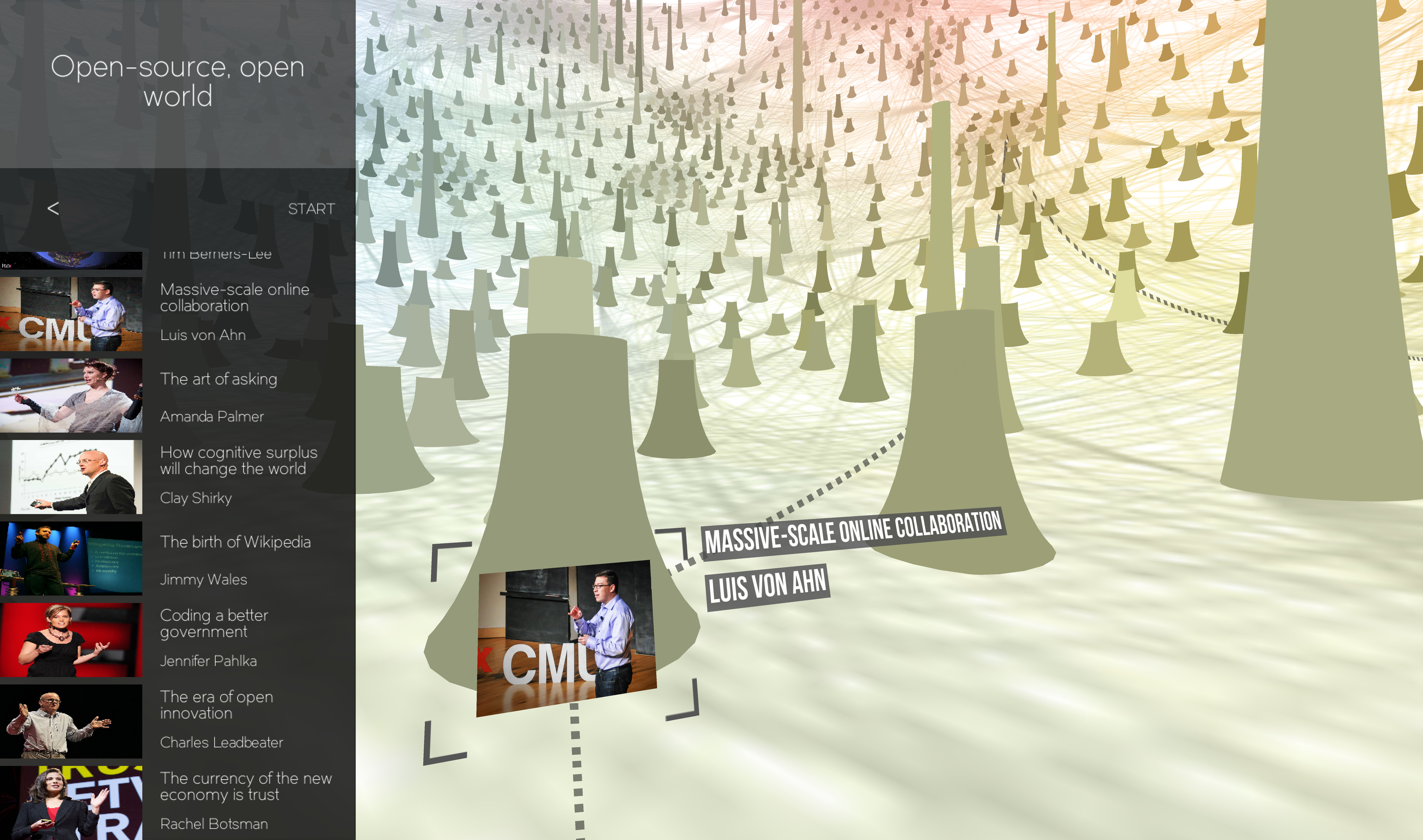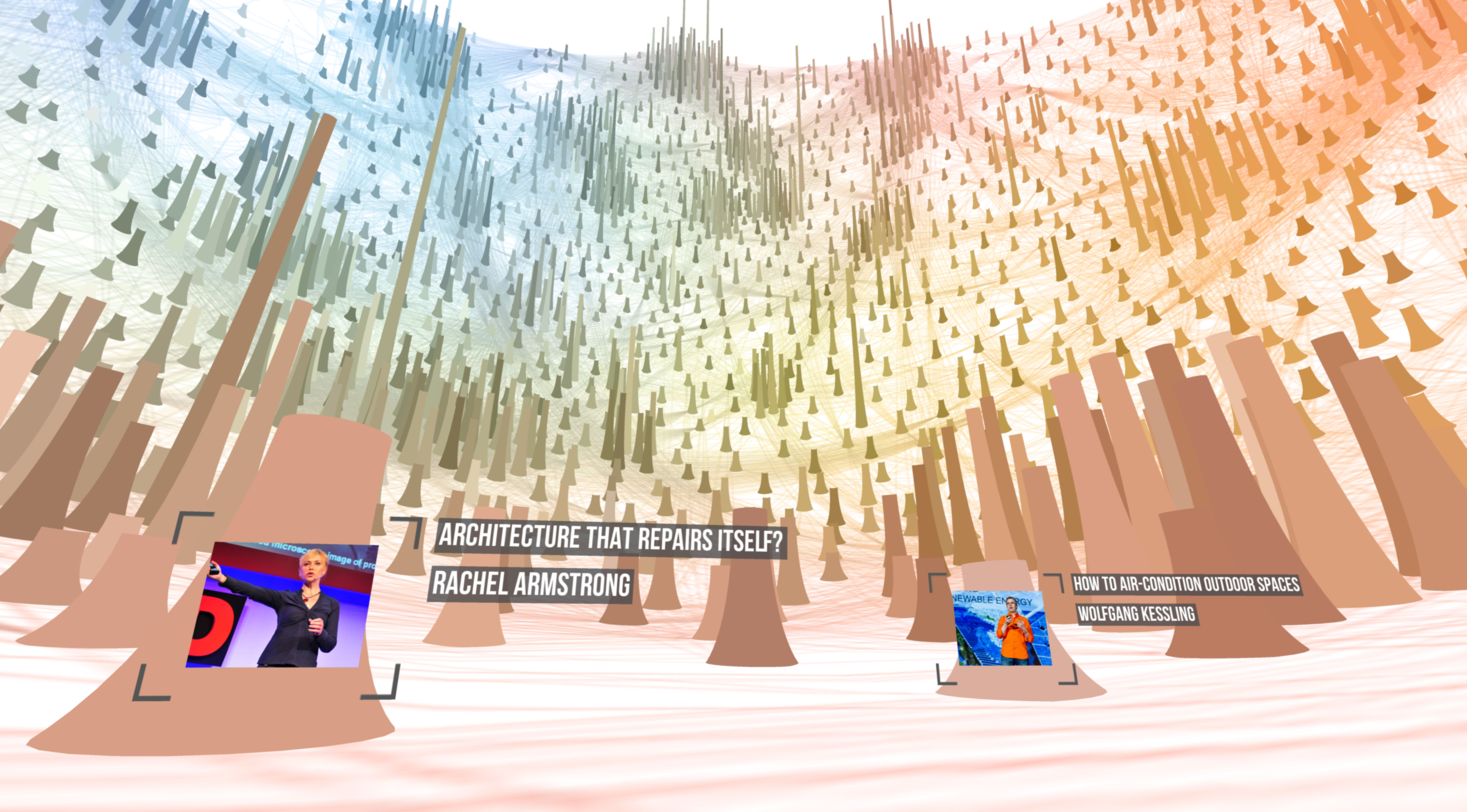 In essence it's a search engine that uses 3D visualisation to allow users to ‘get lost’ within a landscape of information. Currently TED Talks is being used as its dataset, Cheung has organised all two thousand talks into a spatial layout by theme, forming them into conceptual clusters. Essentially this lets users virtually walk around the various TED talks and stumble upon ones that they may not have known about.