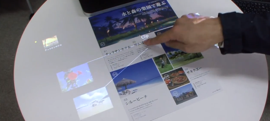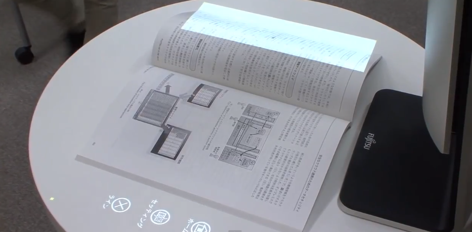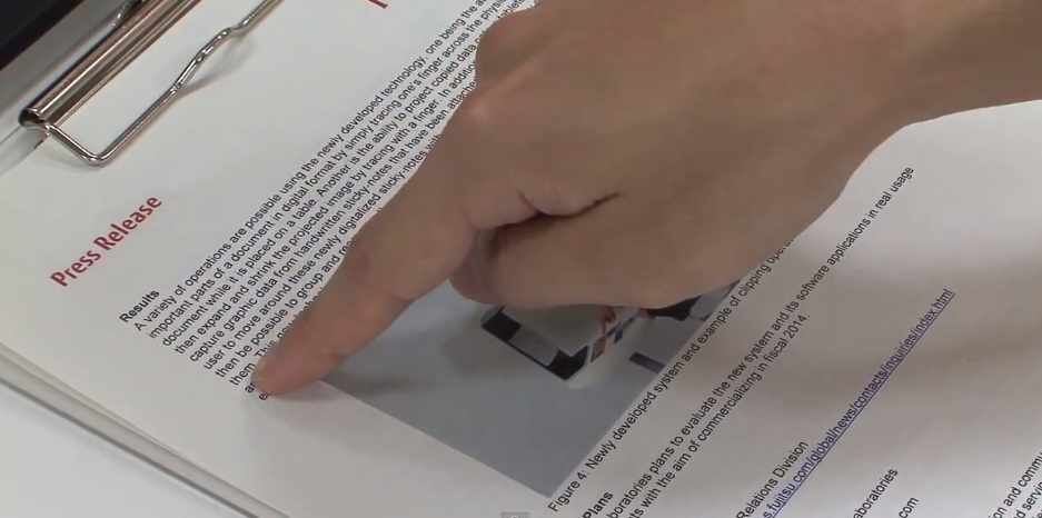 Fujitsu Laboratories have developed a new gestural interface that provides a solution to this problem. FingerLink allows users to seamlessly transfer data between the real and virtual worlds, turning almost any object into a touchscreen. The system detects a user’s finger and allows them to draw boxes around the text that needs to be copied. Users can then extract this material and project it elsewhere.