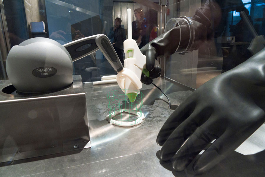 <p>His installation uses a high-tech haptic prosthetic to guide your hand, with which you wield a hot glue gun. Using only haptic feedback you trace the virtual shape into reality. Thisdesign intervention is far from some cybernetic nightmare as the hand merely guides you where to go, and whether or not you obey or how much glue you squeeze on each pass, is completely up to the participant. This results in a wonderfully contingent end product, a far cry from the carbon copy output typical of digital reproductions (see the video for a demonstration).</p>