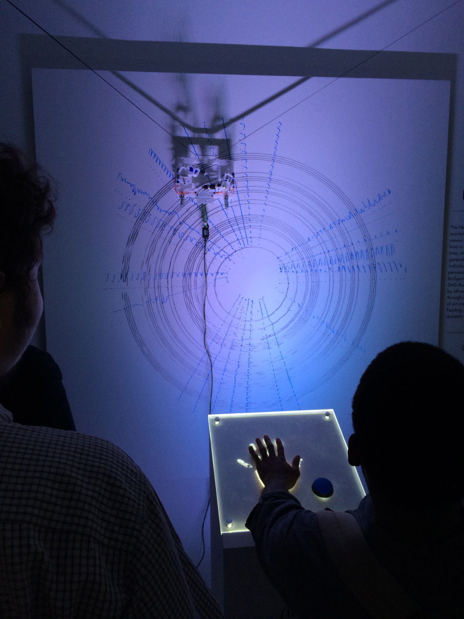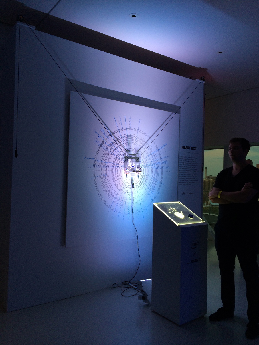To mark SMS Audio’s partnership with Intel and the launch of their new BioSport headphones, 50 Cent and Co. held a party in the New Museum’s Sky Room, exhibiting the latest work from interactive artist Aramique. Aramique, the interactive director at Tool put together a team consisting of Crouse, Matts Mets, Ranjit Bhatnagor, Adam Thabo and Nikolay Saveliev to create the Heart Botinstallation – a drawing machine that would be controlled by the heart rate of each contributor.