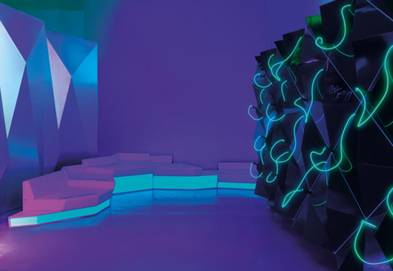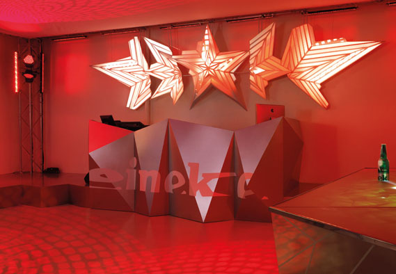 The designers were asked to tackle six key areas to improve the traditional nightclub experience. Waiting at the bar, normally a constant nightmare, was improved with an interactive surface which indicates who's next in line and entertains party-goers while they wait. Interactive games around the club were designed to help people meet and interact, while a huge 3D origami star which hangs above the dancefloor encorporates cutting-edge video mapping technology to connect the crowd and the DJ.