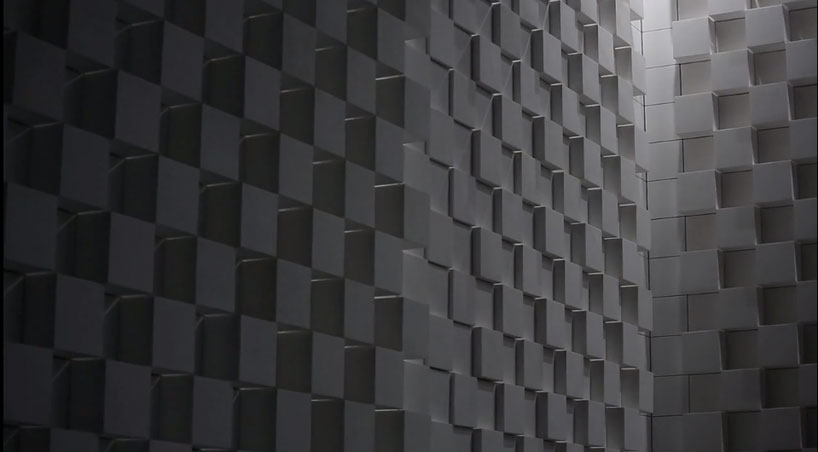 Created for the Hyundai Motor Group Exhibition Pavilion at the 2012 Yeosu EXPO, Seoul based experimental media arts collective Jonpasang have showcased their ‘kinetic vertical landscape’ installation, Hyper-Matrix. The immersive work combines 3D projection mapping techniques, a sound design and thousands of undulating 30x30cm cubes. The wall’s facade is operated by integrated stepping motors, digitally choreographed to alter its interior shape in a mesmerising display of mechanical art.