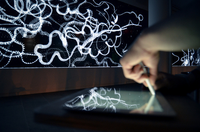Most people don’t really like it when someone watches over their shoulder as they draw. It is usually seen as an intimate activity, reserved for the studio or home environment. But New York-based interactive artist Adriá Navarro celebrates the idea of having an audience as one draws. With his new installation, Inkscapes, he enlisted three artists who create drawings on the iPads during the show.