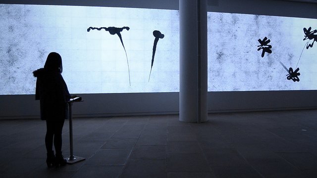 Their artworks are then scaled up to appear on the giant 120 by 11 ft video wall in front of them. The content of the installation is, therefore, different every time. While the lines and swerves on the screen retain a traditional feel of an ink drawing, they are also augmented by glitches giving the whole process a slightly surreal feel.