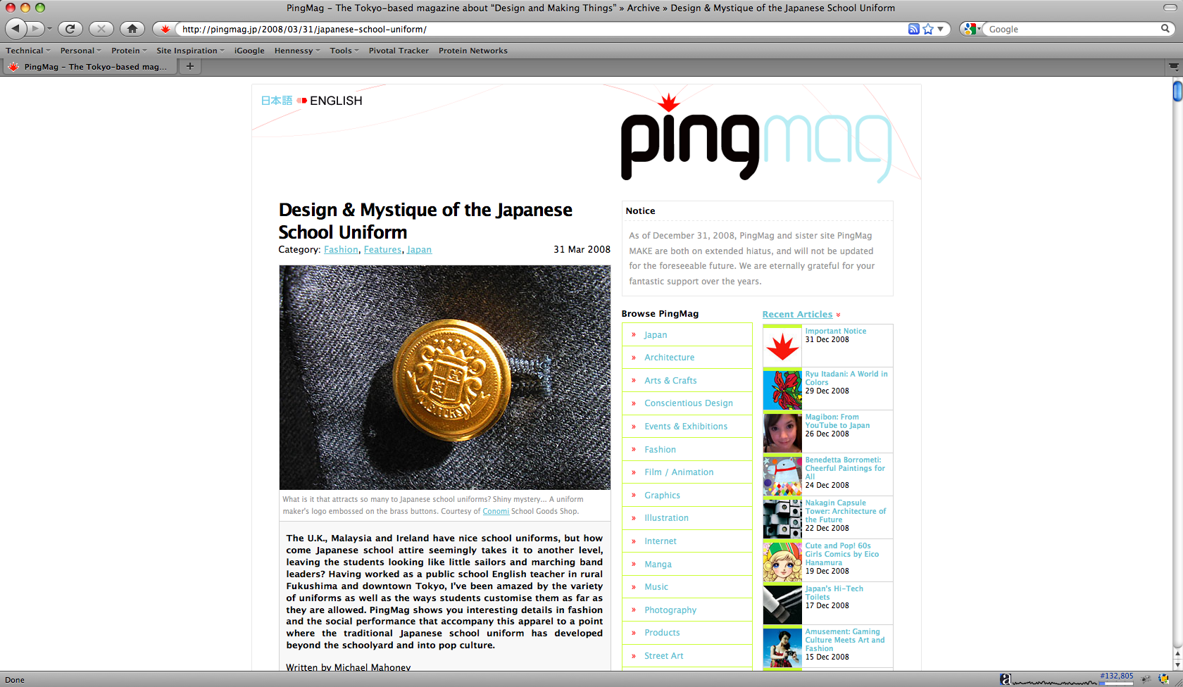 Interesting fashion piece about the design of the school uniform in Japan, where the uniform has kind of transcended the schoolyard to become a symbol of youth and beauty. http://pingmag.jp/2008/03/31/japanese-school-uniform