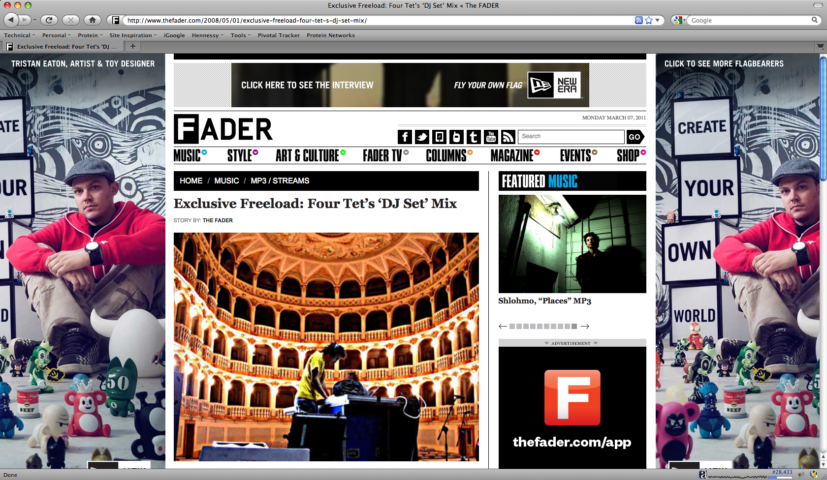 weeow... here is a dj set by Four Tet that was posted at thefader.com so check the link to their article, they pretty much cover the details and setlist better than i could cut and copy anyway... good times http://www.thefader.com/articles/2008/5/1/exclusive-freeload-four-tet-s-dj-set-mixhttp://thefader.cachefly.net/Four_Tet-DJ_Set.mp3