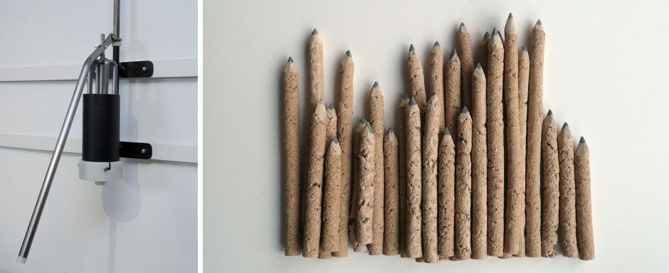 It makes sense then, that a better way of sourcing raw materials might be to salvage what we already have around us. Ariane Prin, a recent design graduate from the RCA in London, did just this for her graduate project, entitled From Here For Here. She built a device that makes pencils using waste material that had been locally sourced. So locally, in fact, that it came from the college’s own skips, rubbish bins and waste units.