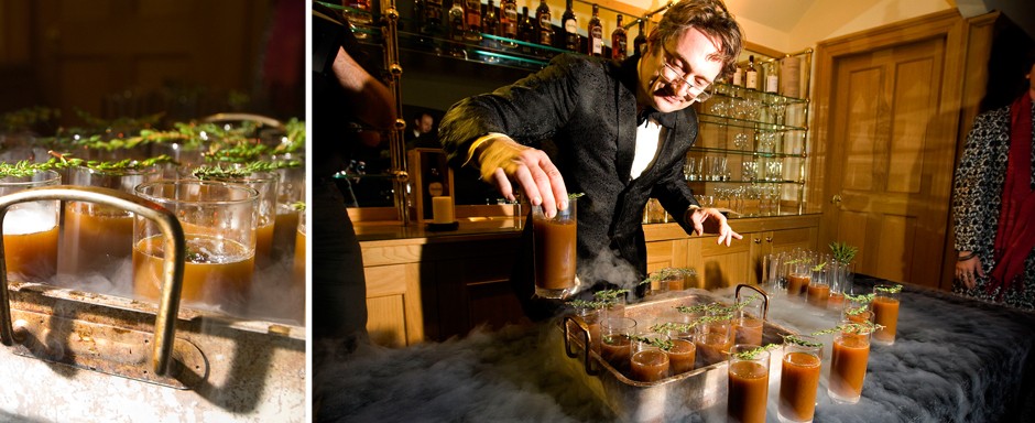 Other chefs too are exploring similar sensory variables. At London Design Festival in September last year, an event called Secret Sensory Supers, curated by design agency FranklinTill, and held within an ancient masonry temple inside – would you believe it – Liverpool Street Station, explored how sound and vision can affect how we eat. At one of the evenings, called the MaSonic Suppers, instigated by sound design agency Silent Studios, guests were served food inspired by the structure of a musical sonata, and many were asked to play different musical instruments before they sat down to eat. At another evening during the event, this time hosted by the ubiquitous culinary artists and occasional jelly-mongers Bompass & Parr, guests watched surreal cult film classic Holy Mountain while the tucked into dishes such as pig’s ear soup. ‘Gird your loins,’ announced Sam Bompas prior to service, ‘the first two courses are rather savage.’ Caroline Till, one half of the event’s curators, explains the event was in response to growing questions around our consumerism, and how there is now an appetite for experiential moments. ‘There’s a thirst for creative and unusual non-material experiences,’ explains Till.