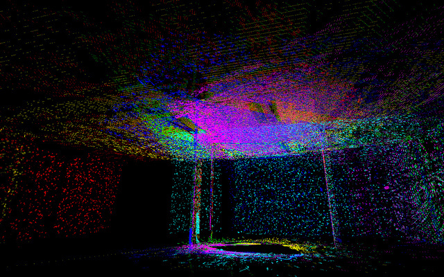 Created for the CLICK Festival in Denmark, the installation required a series of five or six structured light scans, 41 pictures each, where McDonald and Jogenjan photographed different light projection patterns. They then analysed the position of every projected pixel and used SketchUp software to build a 3D model that allowed them to translate all the data into a glittering spectacle.