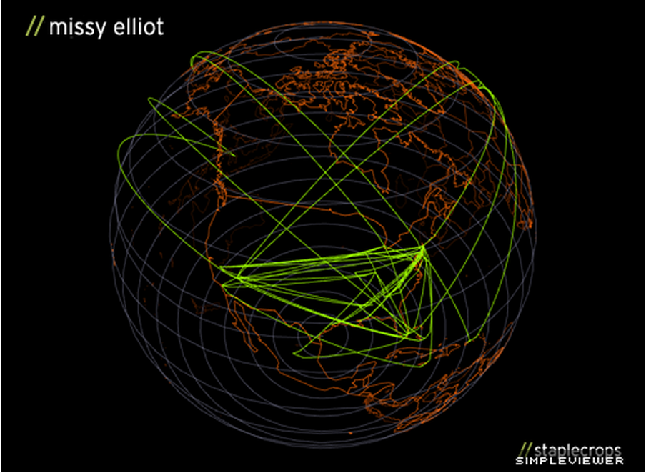Musical anthropologist, Tahir Hemphill, has contemplated this fact in a recent project, Maximum Distance. Minimum Displacement, which compares rappers’ origins to the geographical ambitions mentioned in their lyrics, producing artworks from the analysed information. These works, inspired by Pablo Picasso’s light paintings, see twelve hip hop artists’ global dreams visualised, tracking the distances traveled by their imaginations.