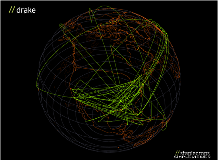The project uses the semantic analysis of words compiled from Hemphill’s previous project, Hip-Hop Word Count (a searchable, ethnographic database built from the lyrics of over 40,000 hip hop songs), to extract geographic statements by specific rappers. These mentions were translated into geo-coordinates, plotted into a robot arm’s movements and finally drawn by the robot holding a light pen. Amongst the results are the imaginative global ramblings of Nas, Drake, Missy Elliott, Cam'ron, Kendrick Lamar and more. The project was completed at the Frank-Ratche STUDIO for Creative Inquiry at Carnegie Mellon University.