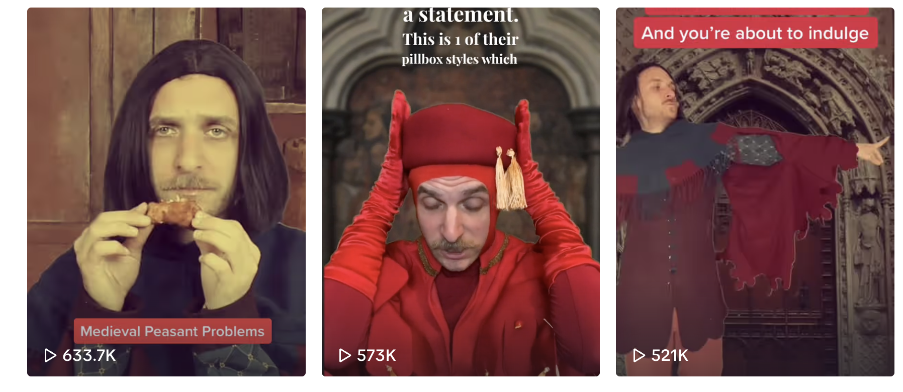 One online creator embracing the potential for queerness and drag via the Middle Ages is @greedypeasant, who describes his account as a ‘Queer Medieval Fever Dream 🏰💅’. The Greedy Peasant character is obsessed with tassels, pageants, astrology and cemeteries, with videos featuring tasselled, feathered, sequinned and otherwise elaborately decorated outfits and and costumes for pageant participants. His enthusiasm for pageants and saint days as opportunities for dress-up and hedonism parallel the ways that ‘balls’ acted as vehicles for more explicitly queer expression in 80s and 90s New York. The current ‘renaissance’ of Renaissance Faires can be similarly seen as an outlet of expression that can be used to explore queerness with an antiquated twist. Greedy Peasant’s videos capture the genuine ways that people in Medieval Europe created outlets for celebration and pleasure-seeking, within the context of an otherwise hierarchical, heavily Christian society.