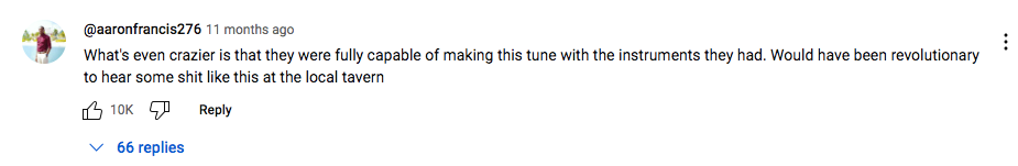 Bardcore is a musical microgenre I became aware of after hearing a cover of Yeah! by Usher. Featuring covers of pop, R&B and rap songs using Medieval instrumentation, bardcore emerged around 2020 with accounts like Beedle the Bardcore and Hildegard von Blingin leading the genre. Most bardcore is instrumental, and the tunes are always familiar. I think hearing a good Medieval style cover of a modern song, from Africa by Toto to No Scrubs, is such a joyful experience because it connects you to a timeless sense of how music and its emotional associations can be conveyed, regardless of the instruments and technology available at that point in history. As one commenter puts it under the ‘Yeah!’ but it’s Medieval’ Youtube video: