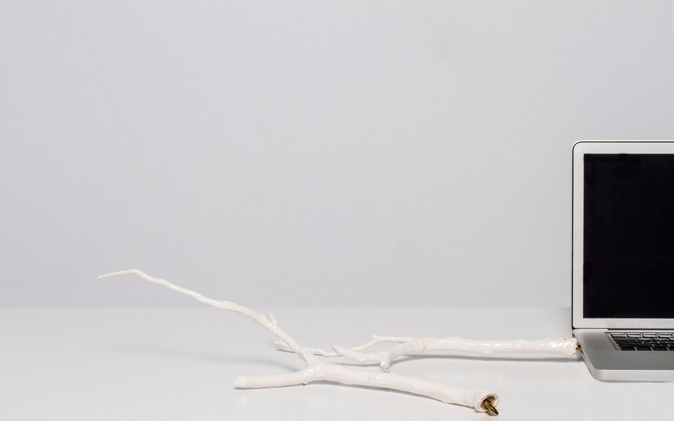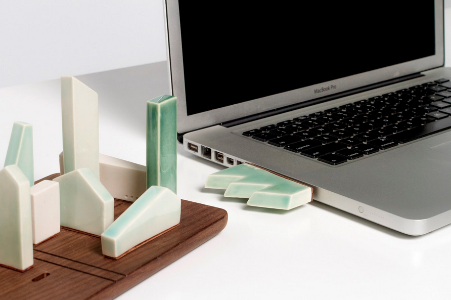 For her thesis project at Isituto Europeo di Design, Vanessa Redondo sought to bring back the memento for the digital era with a series of artfully designed USB drives. Each drive was designed with a theme in mind: life, secrets, and work. Life, intended to store photos of vacations, celebrations, etc, is a series of white branches that fit together into a single, large tree limb. Secrets, a drive in the form of a feathered pendent hanging from necklace, keeps those private conversations, secrets, and naughty pictures close to the chest. Perhaps the most visually compelling of the series is Work, a series of jagged porcelain sculptures in soothing shades of aqua, green, and white on glossy wooden docking base.