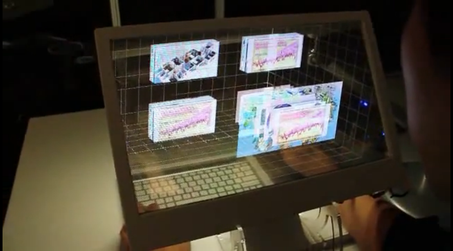 Jinha Lee, a PhD student at MIT Media Lab and intern at Microsoft Applied Sciences, has developed a prototype for a transparent 3D desktop computer screen. The device lets a person arrange virtual objects with his or her hands by reaching into a projected 3D output space behind a transparent screen.The keyboard doubles as a trackpad and makes switching back and forth between 2D and 3D interactions easy – just by lifting your hands, a virtual desktop with a 3D grid appears. In addition, head motion is captured, making sure that the perspective is always correct when the person using the computer moves positions. The technology uses Kinect, Microsoft’s body-tracking camera for Xbox 360, in addition to a lot of pretty smart software.It's probably a while to before we'll see something similar on our own desktops, but the device shows how, with gadgets such as Kinect now being commonplace, that interaction design is becoming more gestural and intuitive.