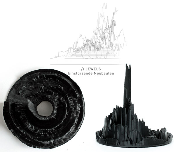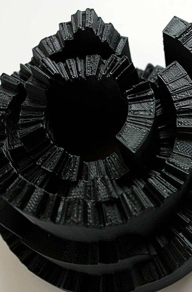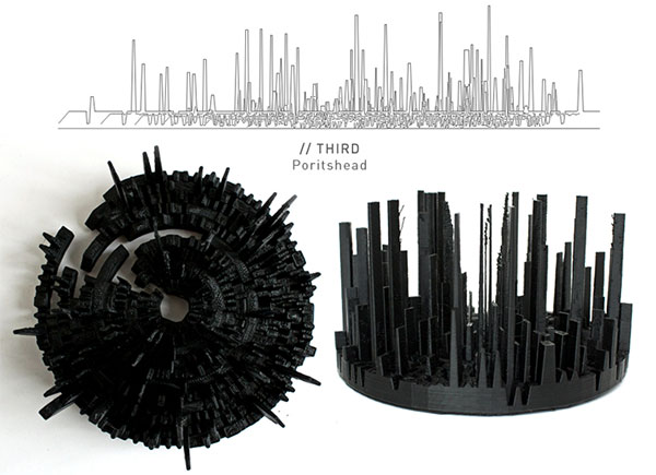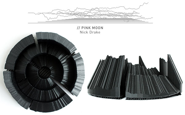 Billed as an algorithmic exploration of the music, Realitat selected a selection of albums (including Nick Drake's Pink Moon and Portishead's Third) and converted each into a 3D representation using Processing and Makerbot. Different tracks from the album were 3D printed in a cylindrical form on top of one another, creating different layers and shapes.