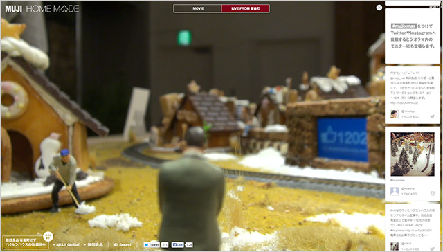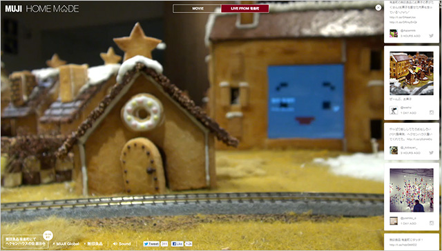 Muji celebrates the season of goodwill with a concept straddling the homely, crafted & nostalgic with the digital, networked & futuristic. An installation in Japan's flagship Yurakucho branch hosts a complete, mini gingerbread village comprised of 100's of 'houses' and candy pieces, all programmed to display realtime tweets and Instagram photos on mini screens embedded on to the 'walls' of the houses.