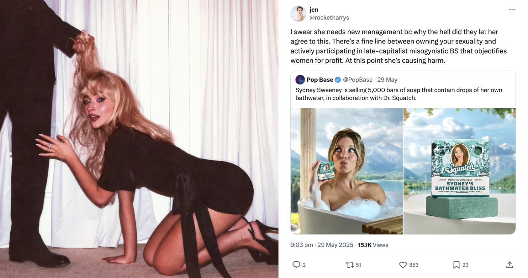2025 has felt like one long sigh over the deemed over-sexualisation of celebrity culture. This was the summer Sabrina Carpenter’s album artwork for Man’s Best Friend triggered furious debate (“not subtle or sex-positive – just soft porn pandering to the male gaze,” according to The Guardian). Sydney Sweeney’s Dr. Squatch campaign selling her bathwater also ignited widespread commotion (“capitalist misogynistic BS that objectifies women for profit,” as one X user posted).