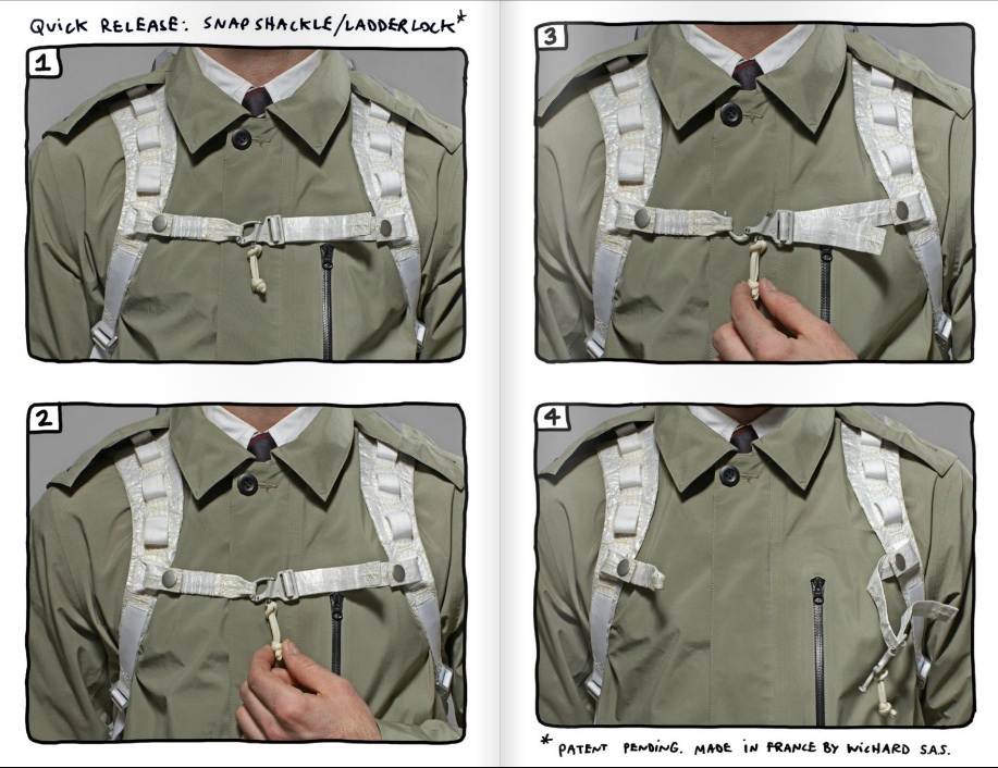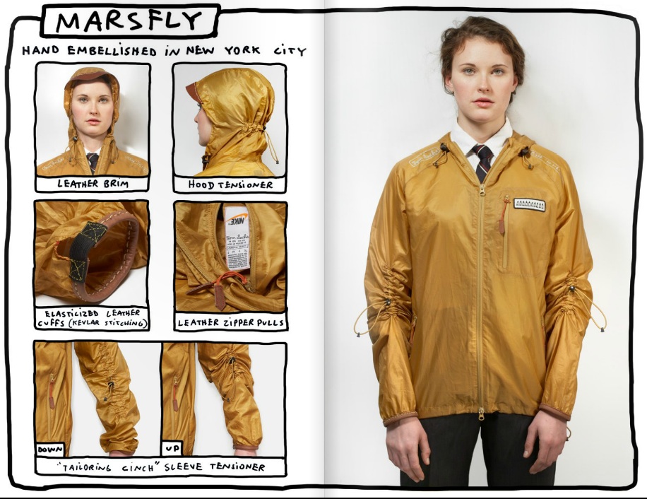 The collection, available at the Park Avenue Armory, consists of five pieces, including the Mars Yard Shoe, a vintage-style trainer in beige and orange, "built to support the bodies of the strongest minds in the aerospace industry." There's the Mars Fly lightweight jacket and the 'Airbag bag' built with automotive airbag materials, aluminum interior dividing clips and a 'paracord' that doubles as a tourniquet. The Chester trench boasts a silver lining featuring the periodic table while the lightweight tote is billed as for, 'everyday superheroes' with grappling hooks and storage cases to boot.