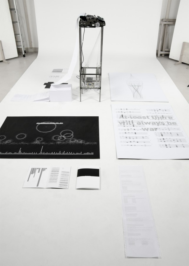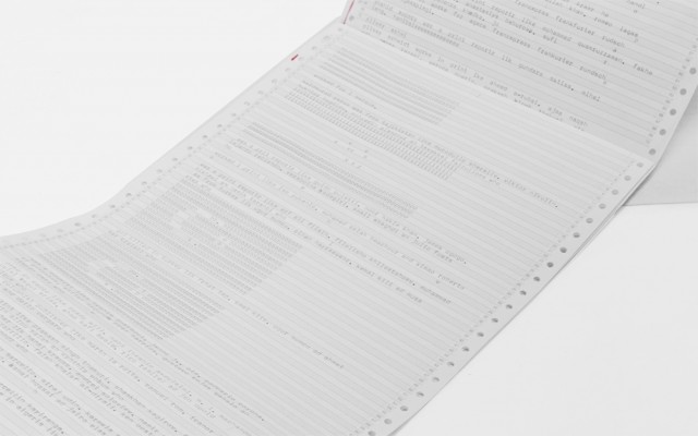 The expansive installation culls information about the deceased reporters and their work from sources like the Committee to Protect Journalists and is generating one unending typewritten text. The information is also used as the basis for an accompanying magazine and set of prints.