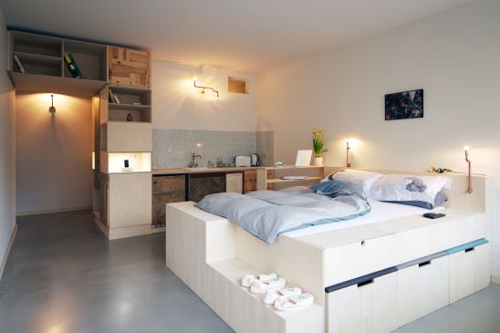 Designed by architects Paolo Bagna and JP Coss, the ecological hotel-apartment is situated in a 1970s residential block in the up-and-coming Berlin neighbourhood of Kreuzkölln and is made from a mixture of new and salvaged materials.