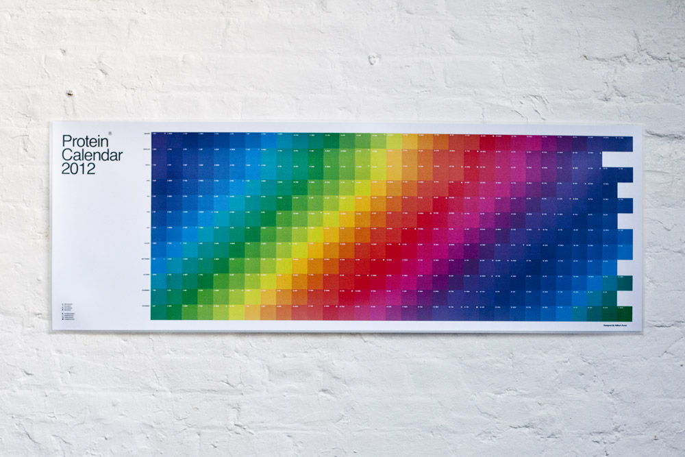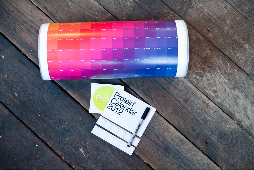 We're super excited to announce that the Protein Calendar 2012 is here!If you've been following our work you'll know we love Chromo. This is why for 2012 we have decided to bring back the popular CMYK colour fade implemented in last year's sold out calendar, which maps out the entire upcoming year's lunar positions. As well as looking mighty good, the Protein Calendar is practical too. It's entirely coated in plastic so you can write whatever you want on it with a non-permanent marker (which is supplied) and it can be used either landscape or portrait depending on what you choose. The calendar measures up to 120cm x 42cm and you can pick 'em up at the Protein Store for just £20.Happy New Year.