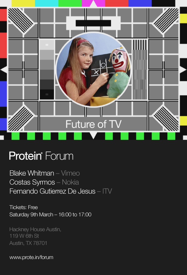 The official (re)launch of Protein TV will be at SXSW as part of Hackney House Austin, a 3,000+ sq ft space showcasing 25 of the finest Shoreditch businesses, as well as being a welcome hangout, complete with free WIFI, coffee, meeting spaces and power chargers. We will be hosting a Protein Forum on “The Future of TV”, on Saturday 9th March from 4pm-5pm, with Blake Whitman from Vimeo, Costas Syrmos from Nokia Films, Fernando Gutierrez De Jesus from ITV NEW and hosted by Protein’s Founder and CEO William Rowe.
