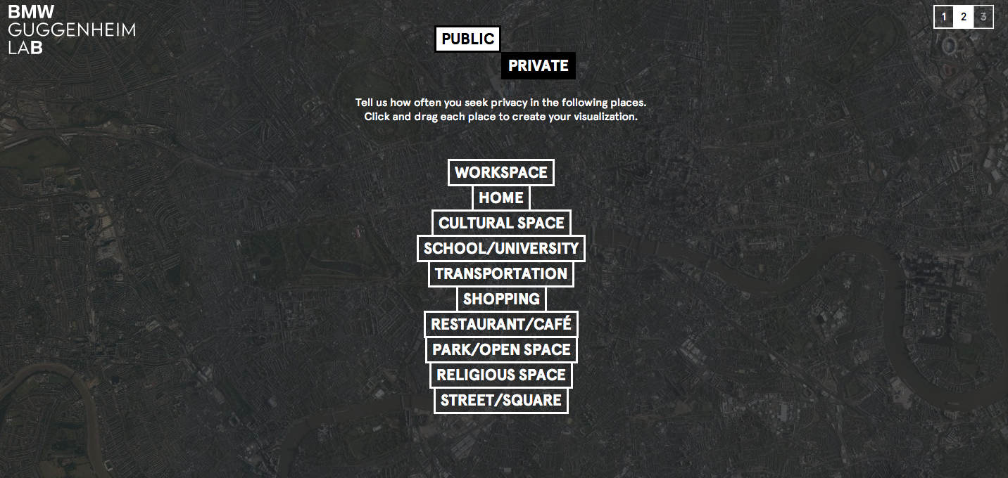 BMW Guggenheim Lab created a simple interactive survey, that lets its users explore the topic of privacy by looking at where it can be experienced in their city. Users are presented with a variety of spaces ranging from museums to workspaces, allowing them to select where they most often look for retreat.