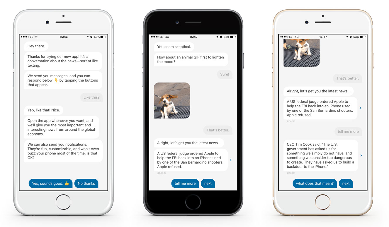 Now, purveyors of global economy journalism, Quartz have upped the ante by releasing an app purpose built to imitate the interface users of iOS’s messaging service have grown accustomed to. In this way, journalism can live “natively on your phone”. Quartz will send messages, GIFs and links to those who download the app. However, none of these notifications are intrusive or written by automotive bots. Humans generate the app's voice.