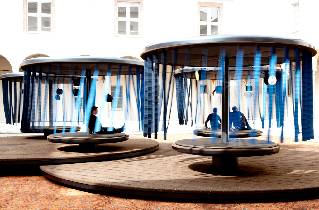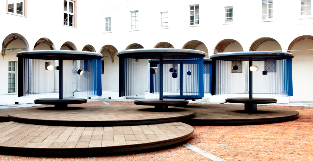 For Salone del Mobile, BMW i commissioned France’s Bouroullec brothers, who transformed a Milan courtyard into an abstract spatial expression of the brand. The resulting quartet of slowly-moving, fabric-fringed merry-go-rounds in no-gloss materials make for a serene space in which visitors are invited to contemplate what a shift towards electricity as silent motive force might mean for transportation design. Does the loss of a growling V-8 mean that a car should lose its aggressive look, as well? The space is an interesting subversion of the emotional, visceral “Ultimate Driving Machine” ethos its big-brother brand is iconic for, and likely provides insight into the future of BMW as a whole.
