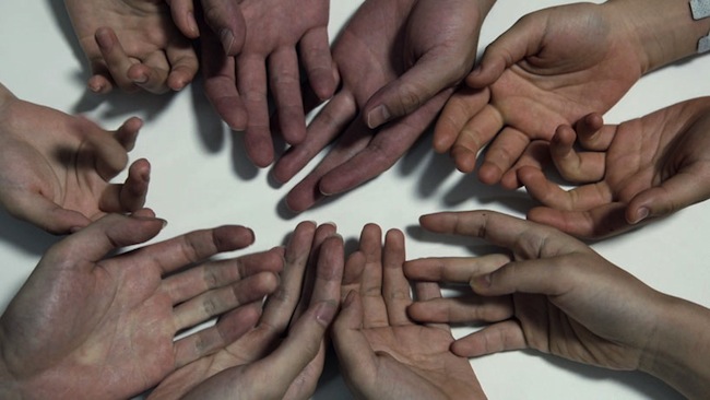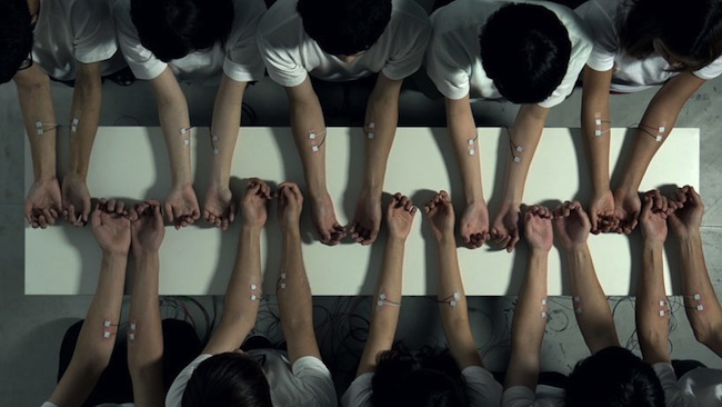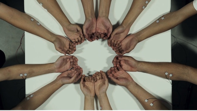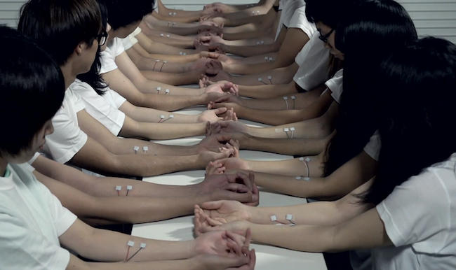 Attaching the devices to the arms and hands of the 40 involved, Daito was able to visualize the music through the bodies of the participants: involuntarily jerking and pulsing their arms, hands and fingers with each beat.