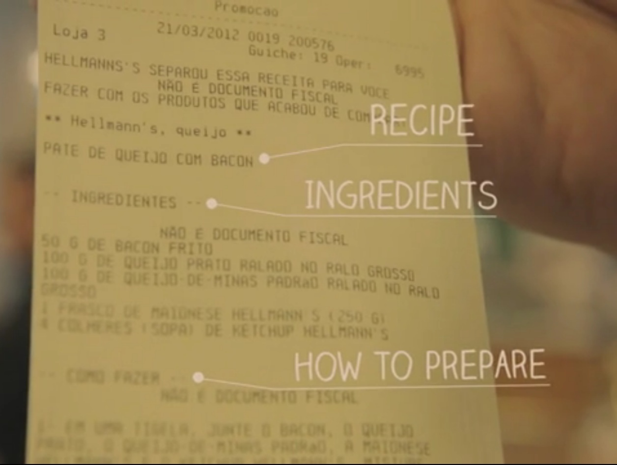 Joining forces with local supermarket chain St Marche, special software was installed into around 100 cash registers which registered what items each shopper was buying. If the software recognized Hellmann's was in the cart, it would print a unique, custom recipe on the receipt incorporating Hellman's with some of the other ingredients also purchased at the same time. For example, a purchase of fish, parsley and mayonnaise would result in a recipe for fried fish with a white sauce.