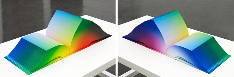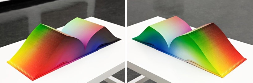 Tauba Auerbach's RGB Colorspace Atlas looks like a randomly tie-dyed tome, but there's a method to the apparent madness. Each of the three 3632 page, 20.3 x 20.3 x 20.3cm books illustrates a different RGB scheme.