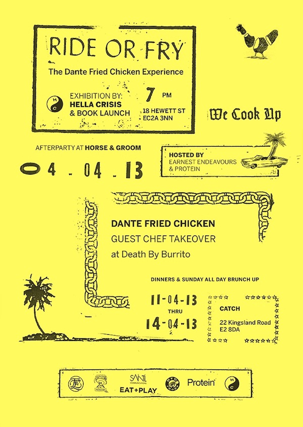 Published by Sterling Epicure (Gordon Ramsey, Bompas & Parr, PDT), Ride or Fry: The Dante Fried Chicken Experience is the three-years-in-the-making debut book from Los Angeles-based chef, Dante Gonzales aka Dante Fried Chicken, co-authored by London-based writer Terence Teh and creatively directed by NYC studio HellaCrisis. The cookbook explores Dante’s ‘celebratory food’ philosophy that delves into over 100 of his signature dishes and his unorthodox background as a 13-year-old runaway from South Central, LA who worked his way up through the restaurant industry to opening an award-wining pop-up food truck and international Ride or Fry cook ups, bringing together food, music and art. To celebrate the launch of Ride or Fry: The Dante Fried Chicken Experience, DFC creative directors - Ariel Roman, Omar Almufti and Yego Moravia of the Brooklyn studio HellaCrisis, have created an installation and print exhibition that will bring the Ride or Fry experience to life on Thursday 4th April at 18 Hewett Street! The exhibition launch will also feature book readings from Dante, and the afterparty will be hosted by long time DFC collaborators Earnest Endeavours and Protein.